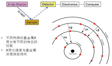 X射線熒光光譜技術(shù)(XRF)的原理見圖3所示,可以直接檢測(cè)固體或液體樣品中ppm量級(jí)的元素成分。采用富集后再檢測(cè)的辦法,使得XRF技術(shù)對(duì)空氣顆粒物中的重金屬成分的檢測(cè)限優(yōu)于0.001ug/m3。而常規(guī)實(shí)驗(yàn)室的檢測(cè)技術(shù),由于預(yù)處理消解過程中需要將微克量級(jí)的樣品溶解到幾十克的液體中,而使得濃度被稀釋百萬(wàn)倍,從而多數(shù)儀器(譬如ICP-AES、或原子吸收光譜儀)無(wú)法檢出元素含量低于10ug/m3量級(jí)的空氣顆粒物樣品。