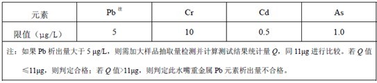 (1)GB/T 17219-1998《生活飲用水輸配水設(shè)備及防護材料的安全性評價標(biāo)準(zhǔn)》主要對水嘴中鎘、鉛、砷、汞、鉻等十種重金屬元素的析出量予以限定,限定要求如表1所示: