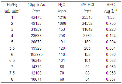儀器首先在標(biāo)準(zhǔn)模式下進行參數(shù)優(yōu)化(利用10μg·L-1的Li、Co、In、U、Ce調(diào)諧液對儀器工作參數(shù)進行調(diào)節(jié),使儀器靈敏度高,同時氧化物及雙電荷產(chǎn)率小于3%);再開啟He/H2碰撞反應(yīng)氣,逐步增大He/H2流量,測試超純水、4%HCl及10μg·L-1 As(4%HCl介質(zhì))在75amu處的響應(yīng)信號,計算其背景等效濃度(詳細數(shù)據(jù)見表1及圖1);并利用As標(biāo)液進一步優(yōu)化He/H2流量,得到儀器工作參數(shù)如表2所示。