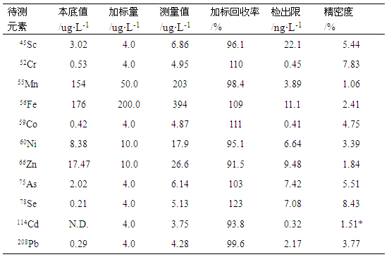 在儀器優(yōu)化工作參數(shù)條件下,對樣品溶液及加標(biāo)樣液進行測試,計算其加標(biāo)回收率;對樣品空白溶液平行測定7次,以三倍空白信號標(biāo)準(zhǔn)偏差/靈敏度對應(yīng)的濃度為檢出限;同時對樣品溶液平行測定11次(間隔2min),計算其相對標(biāo)準(zhǔn)偏差,考察精密度,數(shù)據(jù)見表4。各元素檢出限在0.41-22.07ng/L之間,加標(biāo)回收率在93.82%-123.10%之間,精密度在1.06%-8.43%之間。