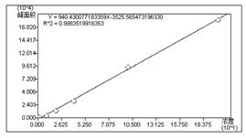 準(zhǔn)確吸取濃度為10ug/mL的甜蜜素標(biāo)準(zhǔn)溶液10ul于50ml離心管中對應(yīng)衍生物濃度分別為2ug/mL、10ug/mL、20ug/mL、100ug/mL、200ug/mL,按照上述標(biāo)樣衍生化步驟進行衍生化,進行線性測試。實驗所得線性方程為:y=940.43x-3525.57,線性相關(guān)系數(shù)為0.9984,如圖5所示。