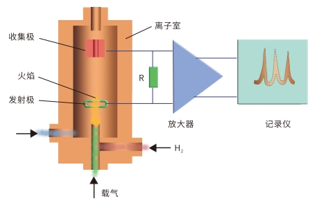 氫火焰離子化檢測(cè)器(FID),它是典型的破壞性、質(zhì)量型檢測(cè)器、是以氫氣和空氣燃燒生成的火焰為能源,當(dāng)有機(jī)化合物進(jìn)入以氫氣和氧氣燃燒的火焰,在高溫下產(chǎn)生化學(xué)電離,電離產(chǎn)生比基流高幾個(gè)數(shù)量級(jí)的離子,在高壓電場(chǎng)的定向作用下,形成離子流,微弱的離子流經(jīng)過(guò)高阻放大,成為與進(jìn)入火焰的有機(jī)化合物量成正比的電信號(hào),因此可以根據(jù)信號(hào)的大小對(duì)有機(jī)物進(jìn)行定量分析。