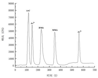 按表2的洗脫條件,進(jìn)樣20.0μg/L砷形態(tài)混合標(biāo)準(zhǔn)溶液,得到五種砷分離色譜圖,如圖2。AsC、As3+、DMA、MMA、As5+相對保留時(shí)間分別為120s、155s、247s、329s、583s,總分離時(shí)間約為600s。