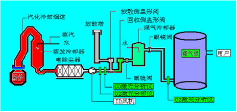 如圖2可見,在回收側(cè)盅形閥/分散側(cè)盅形閥前布設(shè)煙氣在線分析儀,只有當(dāng)通過CO在線監(jiān)測(cè)系統(tǒng)測(cè)得轉(zhuǎn)爐煤氣中的CO濃度在30%以上時(shí),才打開氣體切換站的回收側(cè)盅形閥進(jìn)入煤氣柜儲(chǔ)存,否則通過分散側(cè)盅形閥通過放散塔點(diǎn)火燃燒。在煤氣柜前布設(shè)煙氣在線分析儀,只有在線監(jiān)測(cè)系統(tǒng)測(cè)分析保證煤氣柜內(nèi)O2含量不會(huì)超標(biāo)(控制在1%以下)才允許焦煤煤氣進(jìn)入煤氣柜,否則啟動(dòng)停止回收,以保證系統(tǒng)的穩(wěn)定性和安全性。