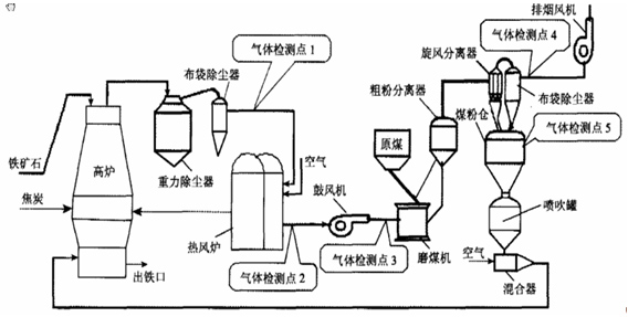 (1)監(jiān)測(cè)點(diǎn)1:高爐煤氣分析,CO和CO2,控制高爐爐況和回收能源氣;