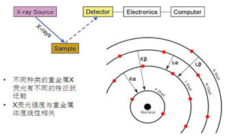 X射線熒光光譜技術(shù)(XRF)的原理見圖3所示,可以直接檢測固體或液體樣品中ppm量級的元素成分。采用富集后再檢測的辦法,使得XRF技術(shù)對空氣顆粒物中的重金屬成分的檢測限優(yōu)于0.001ug/m3。而常規(guī)實驗室的檢測技術(shù),由于預(yù)處理消解過程中需要將微克量級的樣品溶解到幾十克的液體中,而使得濃度被稀釋百萬倍,從而多數(shù)儀器(譬如ICP-AES、或原子吸收光譜儀)無法檢出元素含量低于10ug/m3量級的空氣顆粒物樣品。