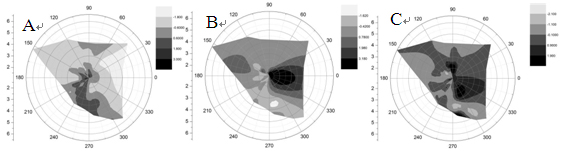 圖6 EHM-X200大氣重金屬監(jiān)測儀監(jiān)測數(shù)據(jù)PM2.5中元素主成分分析得到的各組分與風(fēng)向關(guān)系圖。圖A是組分1(工業(yè)、生活燃料燃燒)的濃度與風(fēng)向關(guān)系圖,從圖中可以看出組分1主要來源于監(jiān)測點位的西南方向(深色區(qū)域);圖B是組分2(冶金工業(yè)廢氣)的濃度與風(fēng)向關(guān)系圖,從圖中可以看出組分2來源于監(jiān)測點自身范圍內(nèi)(深色區(qū)域);圖C是組分3(揚塵)的濃度與風(fēng)向關(guān)系圖,從圖中可以看出組分3主要來源于監(jiān)測點位的東方及北方(深色區(qū)域)。圖中顏色深淺由淺到深代表污染的程度由小到大。
