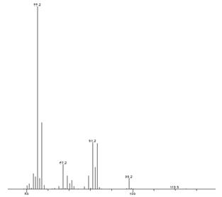甜蜜素的主要衍生物環(huán)己醇亞硝酸酯作為定性和定量,如圖1。保留時間8.511min.定性離子(m/z)為55,81,83。定量離子為55。質(zhì)譜圖見圖2.